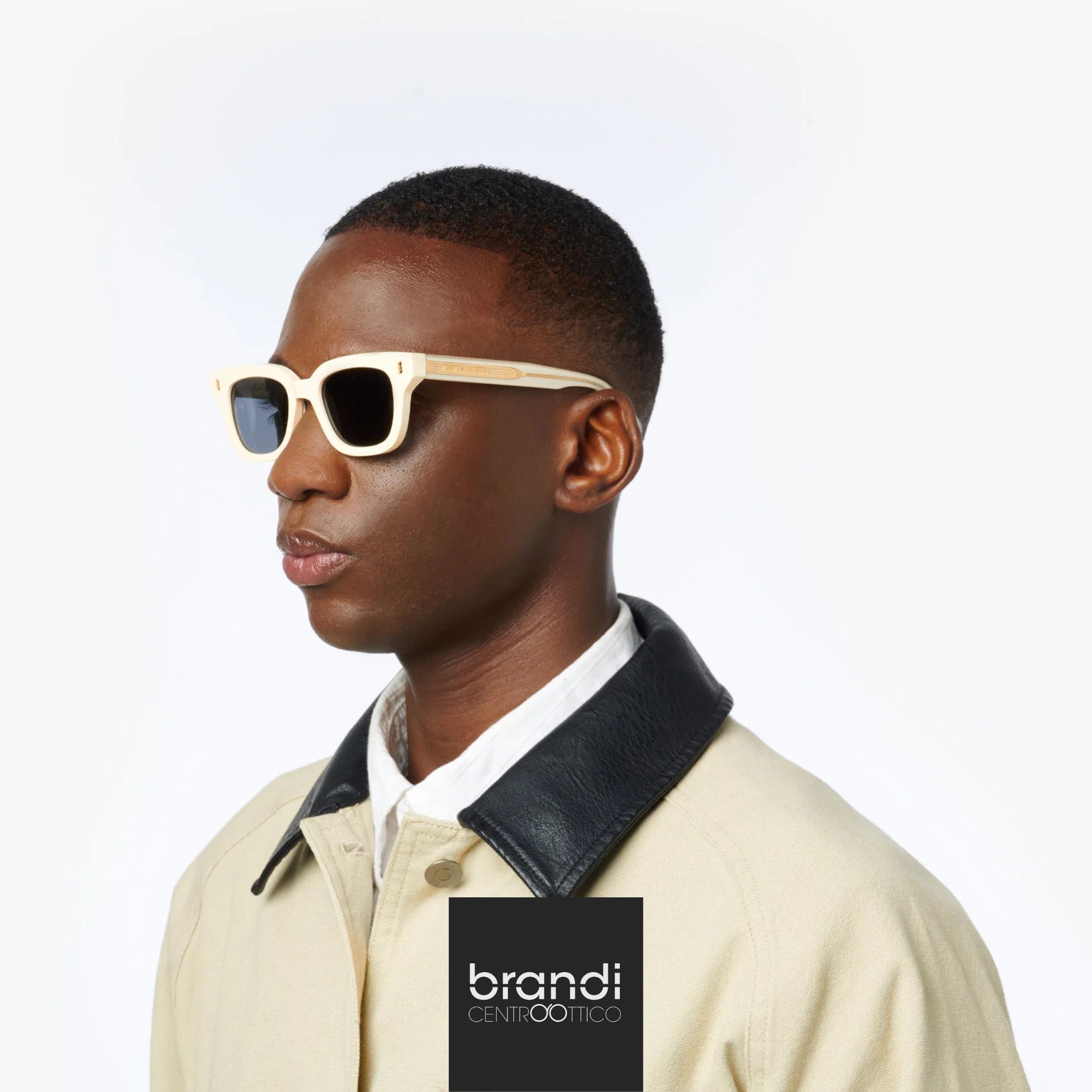 Occhiale da sole fatto a mano con montatura in acetato colore eggshell e lenti in nylon nere semi-piatte con anti-riflesso interno.Cerniera a 5 snodi. Misure 48-20-145